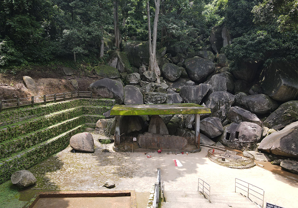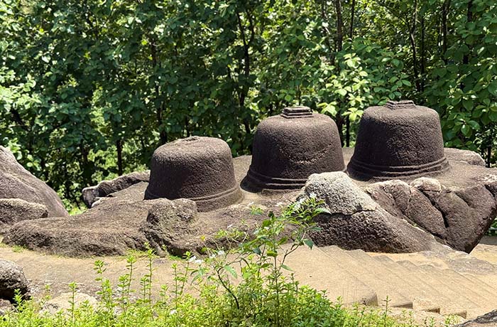 Temples, stupas, and carvings etched into the hillside stand quietly among towering trees and timeless boulders.